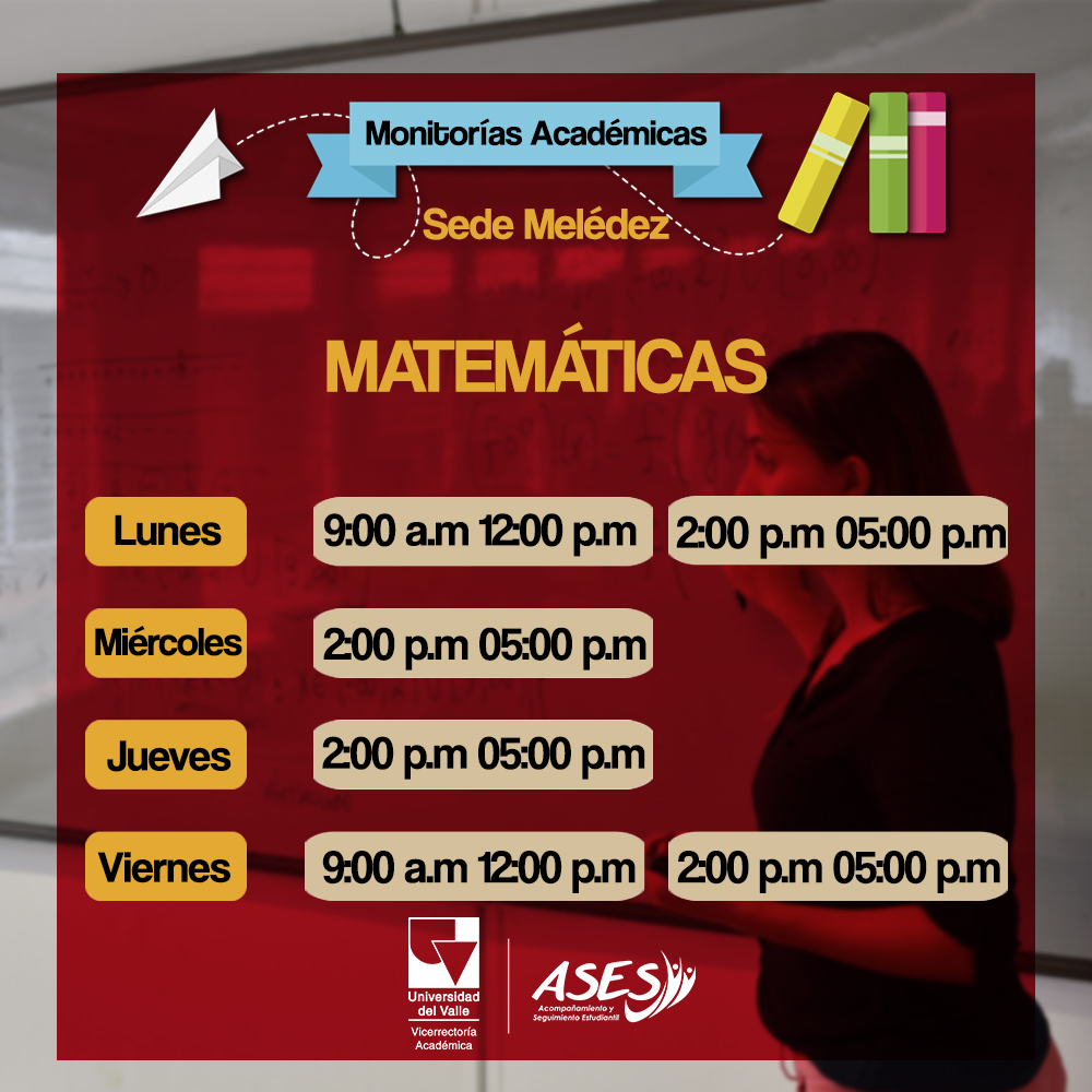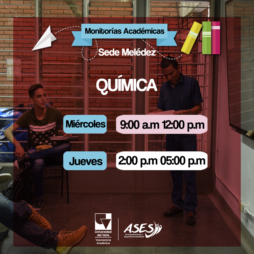 ¿Necesitas apoyo con esos ejercicios de Cálculo, Matemáticas o Álgebra? ¿O te hace falta reforzar Química o Física? Asiste a las monitorías grupales en ASES. Bajos de Biblioteca, Plazoleta Las Palmas, frente al museo. Escoge el horario que mejor se te acomode de acuerdo a tu disponibilidad. ¡Te esperamos!